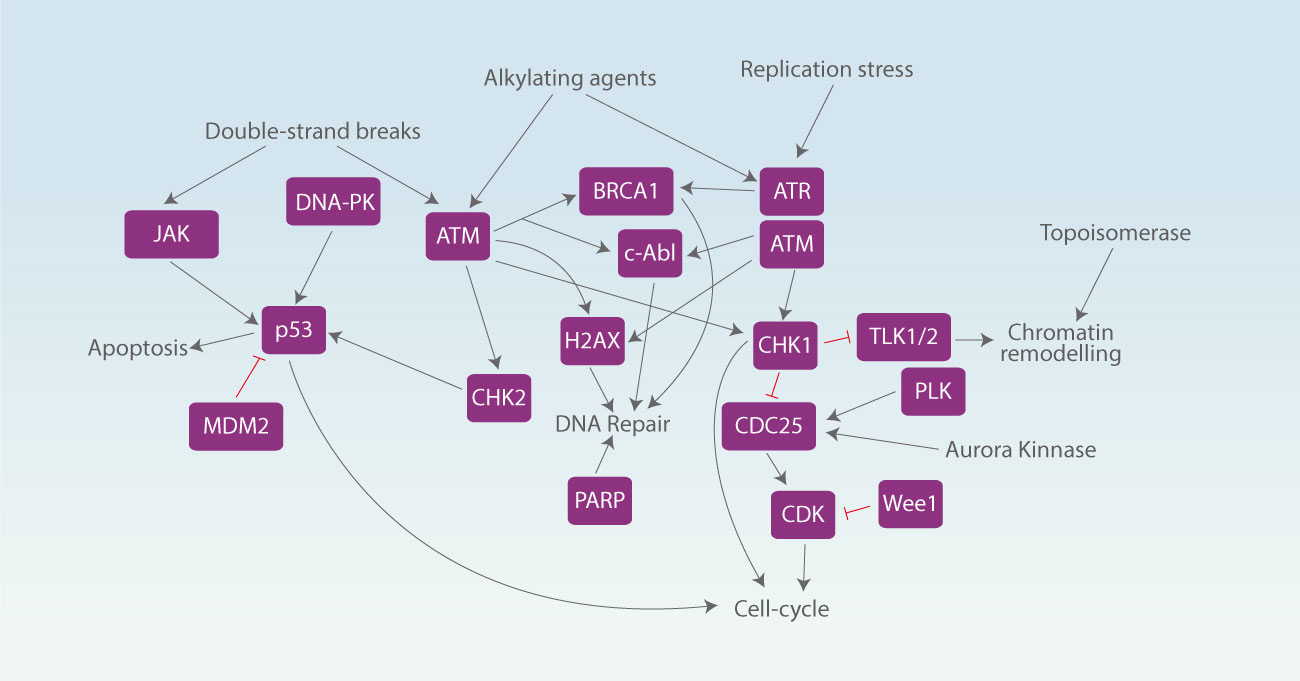 DNA damage is an alteration in the chemical structure of DNA, such as a break in a strand of DNA, a base missing from the backbone of DNA, or a chemically changed base such as 8-OHdG. Damage to DNA that occurs naturally can result from metabolic or hydrolytic processes. Metabolism releases compounds that damage DNA including reactive oxygen species, reactive nitrogen species, reactive carbonyl species, lipid peroxidation products and alkylating agents, among others, while hydrolysis cleaves chemical bonds in DNA. DNA damage response (DDR) is a series of regulatory events including DNA damage, cell-cycle arrest, regulation of DNA replication, and repair or bypass of DNA damage to ensure the maintenance of genomic stability and cell viability. Genome instability arises if cells initiate mitosis when chromosomes are only partially replicated or are damaged by a double-strand DNA break (DSB). To prevent cells with damaged DNA from entering mitosis, ATR inhibits cyclin B/Cdk1 activation by stimulating the Cdk1 inhibitory kinase Wee1 and inhibiting Cdc25C via Chk1, besides, ATM and ATR also initiate DNA repair by phosphorylating several other substrates.