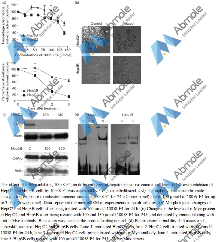 10058-F4 inhibits the growth of leukemic cells and dimerization of the c-Myc/Max heterodimerization to control the cell proliferation, apoptosis, and differentiation, and its aberrant expression. 10058-F4 increased FOXO1 mRNA in MedB-1 cells. 10058-F4 is most efficient in inducing neuronal differentiation and lipid accumulation in MYCN-amplified neuroblastoma cells. 10058-F4 could markedly suppresse the wild-type LKB1 loss-induced cell invasiveness. 10058-F4 increased the chemosensitivity of HepG2 cells to low-dose doxorubicin, 5-fluorouracil and cisplatin.