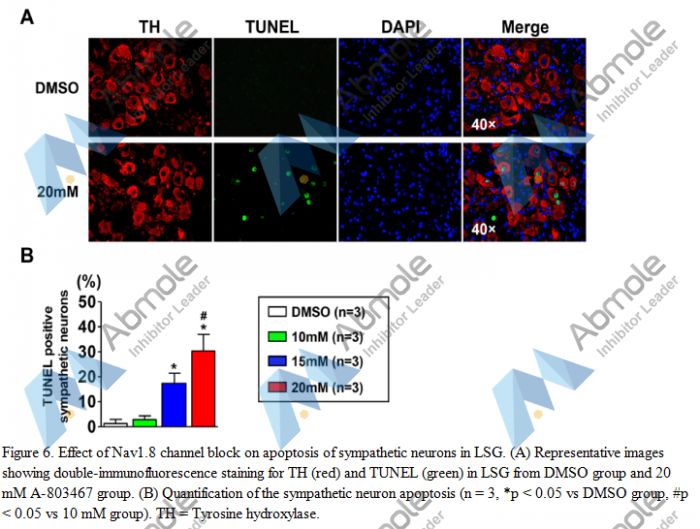 A-803467 is a potent and selective Nav1.8 sodium channel blocker. A-803467 blocks Nav1.8 in both half-maximal inactive and resting states with an IC50 of 8 nM and IC50 of 79 nM, respectively. A-803467 is >100-fold selective vs. human Na(v)1.2, Na(v)1.3, Na(v)1.5, and Na(v)1.7 (IC50 values >or=1 microM). Administration of A-803467 (10-30 mg/kg i.v.) reduced mechanically evoked (10-g von Frey hair) and spontaneous WDR neuronal activity in SNL rats. A-803467 also dose-dependently reduced mechanical allodynia in a variety of rat pain models. A-803467 is the first small-molecule blocker of sodium channels which showing both high potency and significant subtype-selectivity among the sodium channel family.