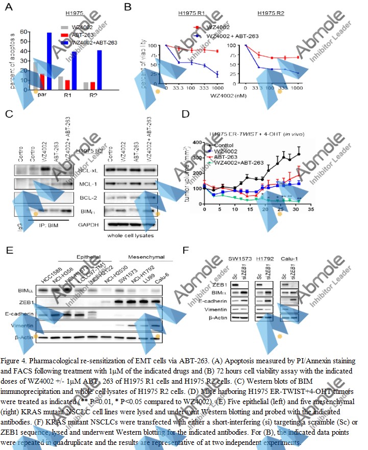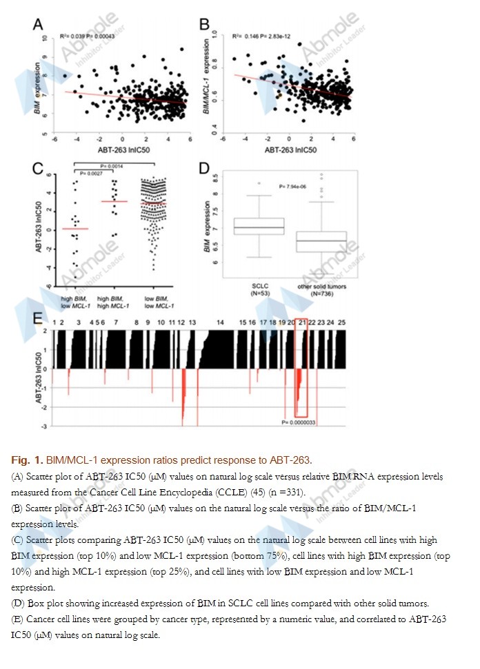 ABT-263, a novel, orally bioavailable, BH3 mimetic, binds with high affinity (Ki ≤ 1nM) and inhibits multiple antiapoptotic Bcl-2 family proteins. ABT-263 displays activity (EC50 ≤ 1µM) against human lymphoid and small cell lung cancer cell lines. Mechanism based preclinical toxicities include reductions in circulating lymphocytes, apoptosis of circulating platelets, and decreased spermatogenesis, mediated by inhibition of Bcl-2, Bcl-XL and Bcl-w with IC50 values of ≤ 1 nM, ≤0.5 nM and ≤ 1 nM, respectively.