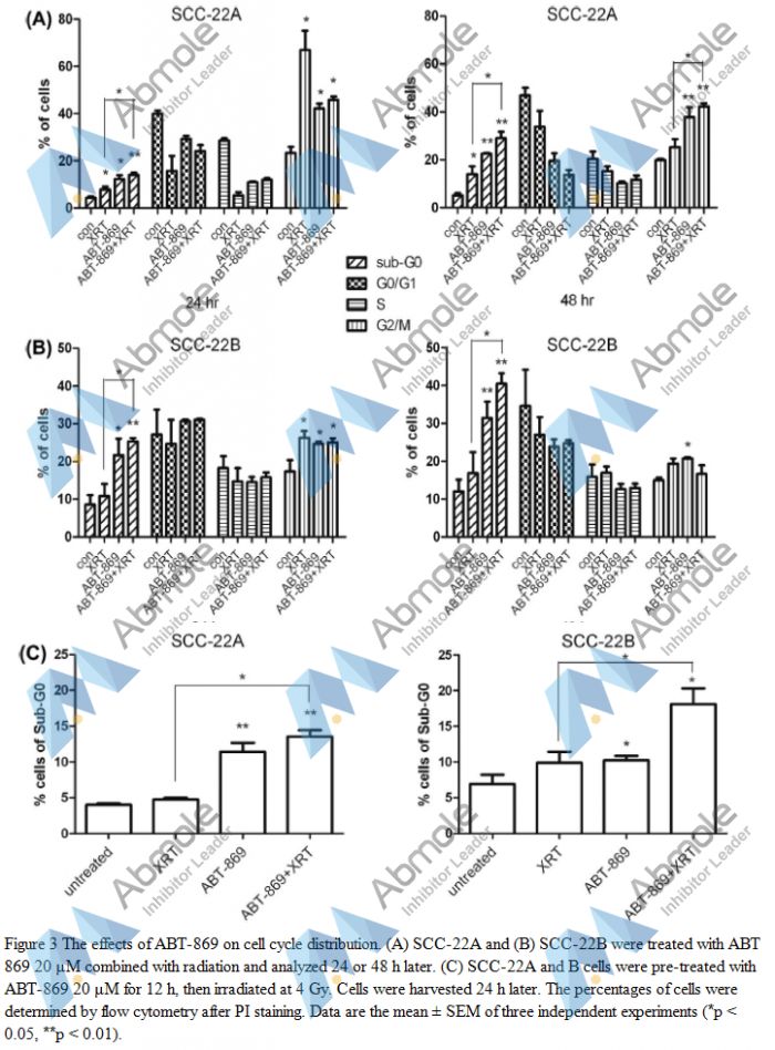 ABT-869 (Linifanib) is an ATP-competitive, multi-targeted RTK inhibitor that is completely effective against all members of the vascular endothelial growth factor (VEGF) and platelet derived growth factor (PDGF) receptor families. ABT-869 (Linifanib) showed potent antiproliferative and apoptotic properties in vitro and in animal cancer xenograft models. The kinase inhibition profile of ABT-869 is evident in cellular assays of RTK phosphorylation (IC₅₀ values of 2, 4 and 7 nM for PDGFRβ, KDR and CSF-1R, respectively) and VEGF-stimulated proliferation (0.2 nM IC₅₀ for human endothelial cells). ABT-869 is active in advanced non-small cell lung cancer as second- or third-line therapy. Increased adverse event rates were observed at the high dose of linifanib.