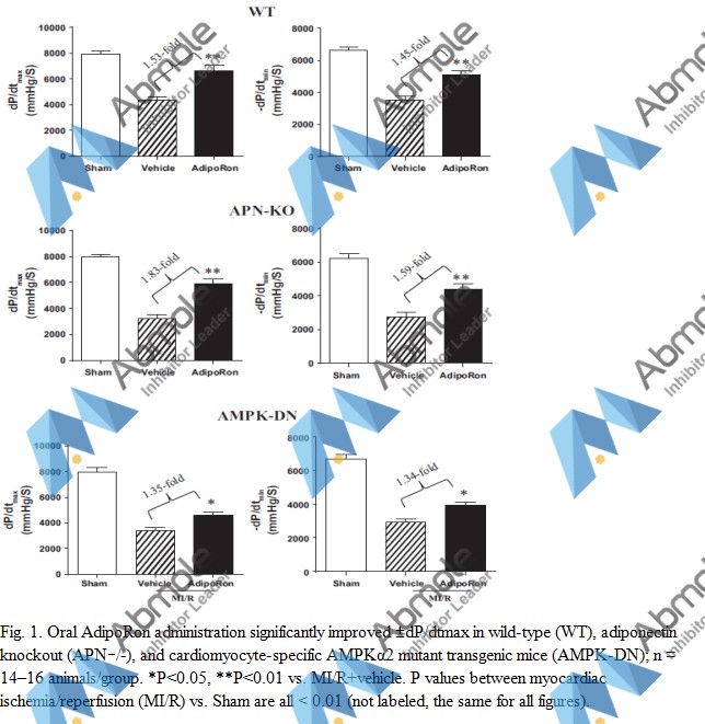 AdipoRon (50 μM) dose-dependently attenuates the expression of TNF-α and TGF-β1 in the L02 cells. AdipoRon exhibits significant and dosage-dependent growth suppression on macrophages. AdipoRon treatment significantly improves cardiac functional recovery after reperfusion, and inhibits post-MI apoptosis.