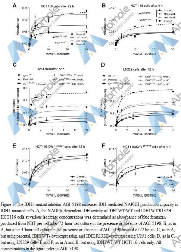 AGI-5198 (also know as IDH-C35) is a potent and selective mutant IDH1 inhibitor. AGI-5198 has been shown to have anti-tumor efficacy in the TS603 glioma cell line and to lower tumor 2-HG production in HT1080 and U87MG cells with IC50 values of 0.48 μM and 0.07 μM, respectively. AGI-5198 (IDH-C35) inhibits IDH1 R132H mutant and R132C mutant in vitro with IC50 of 0.07 μM and 0.16 μM respectively, but not wild-type IDH1 or any of the examined IDH2 isoforms (IC50 > 100 μM). In R132H-IDH1 glioma xenografts, AGI-5198 (450 mg/kg/day) caused 50-60% growth inhibition over a treatment period of three weeks with no affect in the growth of IDH1 wild-type glioma xenografts. Under conditions of near complete 2-HG inhibition, AGI-5198 can induce demethylation of histone H3K9me3 and expression of genes associated with gliogenic differentiation.