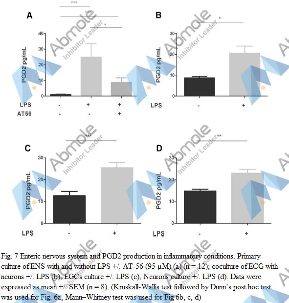 AT-56 is an orally active inhibitor of lipocalin-type prostaglandin D synthase (L-PGDS) (Ki = 75 μM, IC50 = 95 μM). AT-56 Inhibits the production of PGD2 from PGH2 in vitro, with no effect on PGE2 or PGF2α production. AT-56 inhibited human and mouse L-PGDSs in a concentration (3-250 microm)-dependent manner. AT-56 inhibits the L-PGDS activity in a competitive manner against the substrate PGH(2) (K(m) = 14 microm) with a K(i) value of 75 microm. AT-56 did not inhibit the binding of 13-cis-retinoic acid,which is a nonsubstrate lipophilic ligand, to L-PGDS.