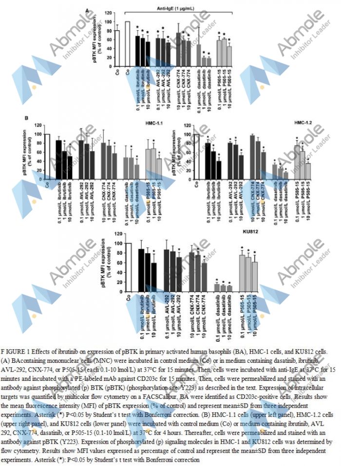 | Preparation method | Immunoblot Analysis. Cells were incubated in serum-free RPMI media for 1–1.5 hours. Isolated human B cells were incubated with CC-292 at a final concentration of 0.001, 0.01, 0.1 and 1 μM. Ramos cells were incubated with 0.1 nM–3 μM CC-292. Cells were then incubated in the presence of compound for 1 hour at 37°C. Following incubation, cells were centrifuged and resuspended in 100 μl of serum-free RPMI and BCR was stimulated with addition of 5 μg/ml α-human IgM. Samples were centrifuged, washed in phosphate-buffered saline (PBS), and lysed in 100 μl of Cell Extraction Buffer plus 1:10 (v/v) PhosSTOP Phosphatase Inhibitor and 1:10 (v/v) Complete Protease Inhibitor. Antibodies used for immunoblot analysis include P-PLCγ2, PLCγ2, Syk, P-Syk, Btk, P-Btk, and Tubulin. Membranes were scanned on a Li-Cor Odyssey scanner using infrared fluorescence detection. |