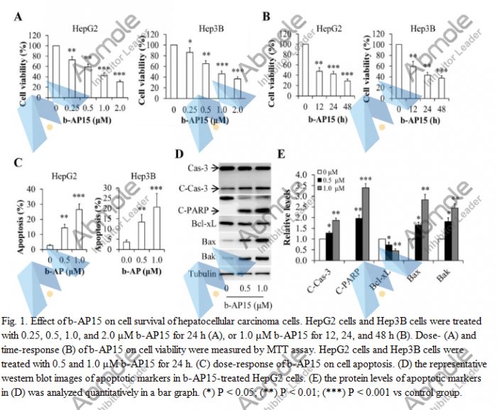 b-AP15 is a deubiquitinases inhibitor for 19S proteasomes activity of Ub-AMC cleavage with IC50 of 2.1 μM. b-AP15 inhibited the activity of two 19S regulatory-particle-associated deubiquitinases, ubiquitin C-terminal hydrolase 5 (UCHL5) and ubiquitin-specific peptidase 14 (USP14), resulting in accumulation of polyubiquitin. b-AP15 induced tumor cell apoptosis that is insensitive to TP53 status and overexpression of the apoptosis inhibitor BCL2.