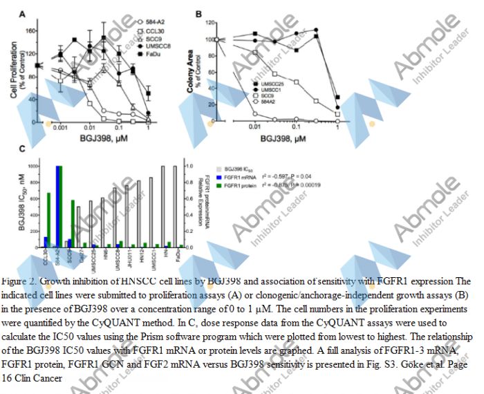 BGJ398 (Infigratinib) is a potent and selective FGFR kinase inhibitor with IC50 values of 0.9 nM, 1.4 nM, 1 nM and 60 nM for FGFR1, FGFR2, FGFR3 and FGFR4, respectively. BGJ398 selectively binds to and inhibits the activities of FGFRs, which may result in the inhibition of tumor angiogenesis and tumor cell proliferation, and the induction of tumor cell death. FGFRs are a family of receptor tyrosine kinases which may be upregulated in various tumor cell types and may be involved in tumor cell differentiation and proliferation, tumor angiogenesis, and tumor cell survival. BGJ398 significantly decreases the levels of pFRS2 and pMAPK in a dose-dependent manner. BGJ398 does not impair VEGF-induced blood vessel formation. In contrast, BGJ398 inhibits significantly bFGF-stimulated angiogenesis in a dose-dependent manner.
