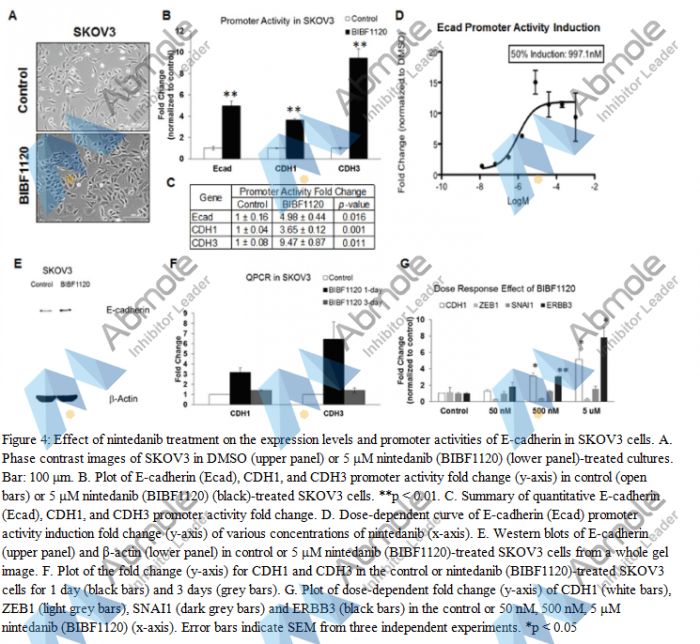 Nintedanib (BIBF1120) is a novel, potent triple angiokinase inhibitor for VEGFR1/2/3, FGFR1/2/3 and PDGFRα/β with IC50s of 34 nM/13 nM/13 nM, 69 nM/37 nM/108 nM and 59 nM/65 nM, respectively.