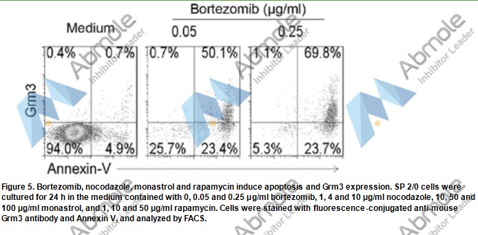 Bortezomib (PS-341) is a highly selective, reversible inhibitor of the 26S proteasome with a ki value of 6nM, which has shown high antimyeloma activity. Bortezomib caused comparable growth suppression in LNCaP-Pro5 and PC3M-Pro4 cells with an IC90 of 10 nM.