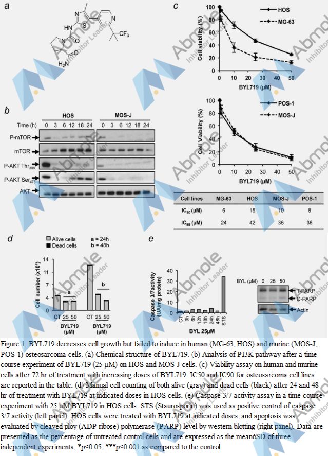 Alpelisib (Byl-719) is an effective, selective PI3Kα inhibitor with oral activity. Alpelisib (Byl-719) was targeted to PIK3CA mutated carcinoma. The IC50 of Alpelisib (Byl-719) against P110 α, P110 γ, p110δ and P110 β were 5 nM, 250 nM, 290 nM and 1200 nM, respectively. It has antitumor activity.