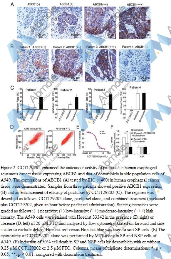 CCT129202 is an Aurora kinase inhibitor with IC50 of 0.042 ± 0.022, 0.198 ± 0.05, and 0.227 ± 0.064 μmol/L for Aurora A, Aurora B, and Aurora C, respectively. CCT129202, a representative of a structurally novel series of imidazopyridine small-molecule inhibitors of Aurora kinase activity. This compound showed high selectivity for the Aurora kinases over a panel of other kinases tested and inhibits proliferation in multiple cultured human tumor cell lines. Importantly, CCT129202 increased the inhibitory effect of vincristine and paclitaxel on ABCB1 overexpressing KBv200 cell xenografts in nude mice and human esophageal cancer tissue overexpressing ABCB1 ex vivo, respectively. Furthermore, the ATPase activity of ABCB1 was inhibited by CCT129202. Homology modeling predicted the binding conformation of CCT129202 within the large hydrophobic cavity of ABCB1. On the other hand, CCT129202 neither apparently altered the expression levels of ABCB1 and ABCG2 nor inhibited the activity of Aurora kinases in MDR cells under the concentration of reversal MDR. In conclusion, CCT129202 significantly reversed ABCB1- and ABCG2-mediated MDR in vitro, in vivo and ex vivo by inhibiting the function of their transporters and enhanced the eradication of cancer stem-like cells by chemotherapeutic agents.