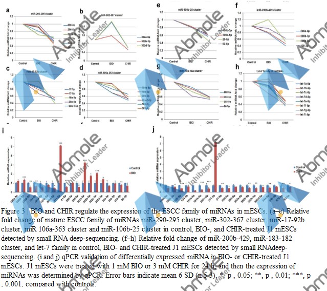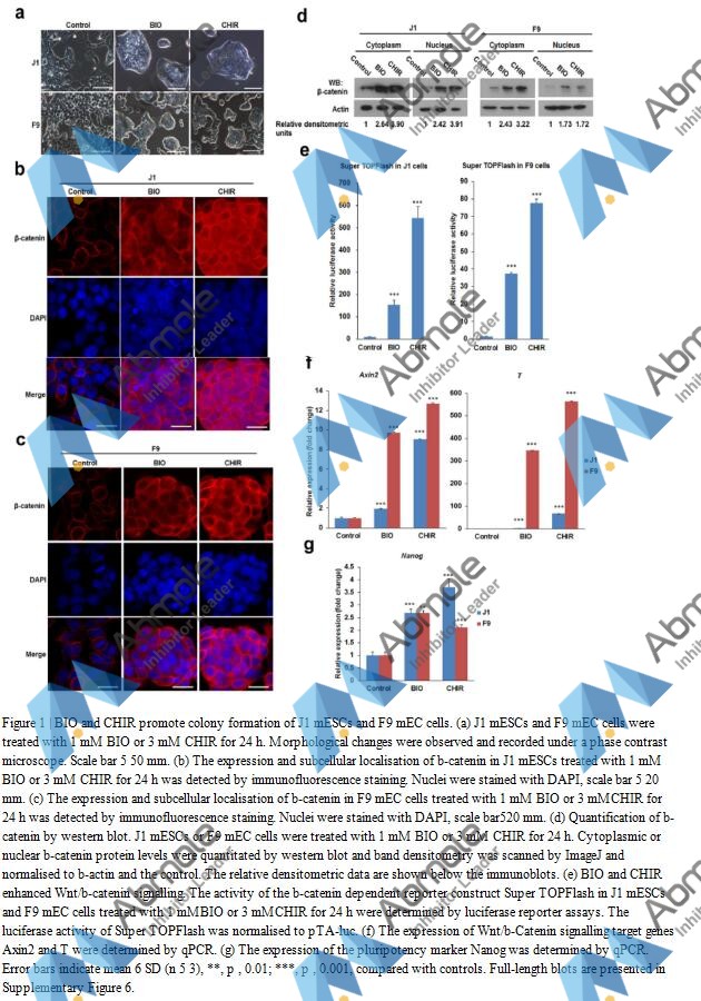 | Preparation method | Immunofluorescence staining The expression and subcellular localisation of β-catenin in J1 mESCs treated with 1 μM BIO or 3 μM CHIR for 24 h was detected by immunofluorescence staining. Nuclei were stained with DAPI. J1 mESCs or F9 mEC cells were fixed and permeabilized using immunostaining fixation buffer and then blocked in blocking buffer (Beyotime Institute of Biotechnology). Subsequently, cells were incubated with the indicated primary antibody overnight at 4°C, followed by three washes with washing buffer (Beyotime Institute of Biotechnology) for 5 min and then incubation with an Alexa Fluor 555-conjugated secondary antibody for 2 h at room temperature. Nuclei were stained with DAPI. Cells were photographed under an inverted fluorescence microscope (Nikon, Tokyo, Japan). |