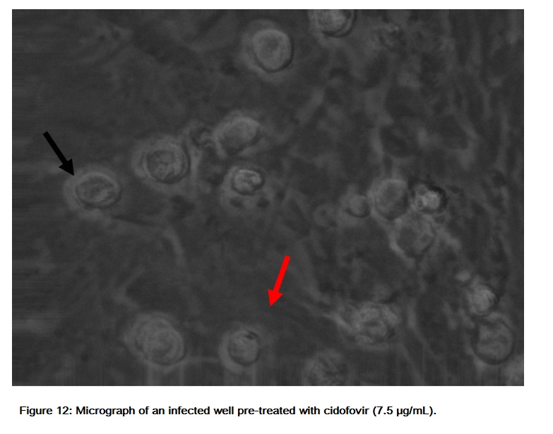 | Preparation method | In vitro efficacy of cidofovir against CHV-1 Madin–Darby Canine Kidney or Vero cells were plated into 96-well plates at 1*104 cells/well and maintained in Dulbecco’s minimal essential medium with 1 g/L glucose, l-glutamine, and sodium pyruvate (Cell Grow; Corning, Manassas, VA) containing 10% fetal bovine serum (Atlanta Biological, Flowery Branch, GA) and penicillin (200 U/mL)/ streptomycin (200 mg/mL) (Life Technologies, Grand Island, NY) for 24 h until confluent. Monolayers were infected with 5 PFU/well CHV-1 (a previously described field strain that was also utilized during the in vivo experimental study evaluating cidofovir) or HSV-1 strain F, respectively. After 2 h of incubation at 37 C, virus supernatants were removed, cells were rinsed once with phosphate-buffered saline (PBS), and 100 mL of sequential 2-fold serial dilutions of cidofovir (starting at 625 mM) was added to each well. Infection controls without cidofovir and noninfected drug-treated controls were also included. Plates were incubated at 37 C until a cytopathic effect (CPE) was visible in the infected nontreated controls, which was *72 hours postinfection (hpi) for CHV-1 and 48 hpi for HSV-1, respectively. Plates were rinsed 3 times with PBS, fixed in 80% ethanol for 10 min at -20 C, and stained with crystal violet (Fisher Scientific, Fair Lawn, NJ). Virusinduced CPE was scored as the percent of wells per dilution with observable plaque formation, and EC50 values were calculated using GraphPad Prism. |
