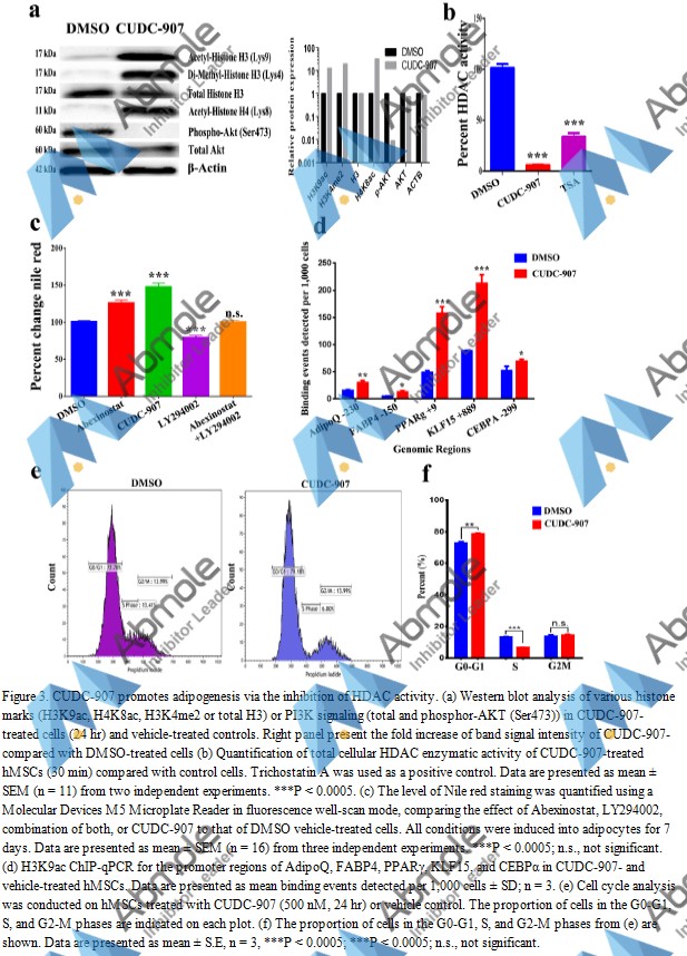 Fimepinostat (CUDC-907) is an orally-available small molecule inhibitor that targets both HDAC and PI3K with IC50 values of 19 nM, 54 nM, 311 nM and 39 nM for PI3Kα, PI3Kβ, PI3Kγ and PI3Kδ respectively. Fimepinostat (CUDC-907) potently inhibits class I PI3Ks as well as classes I and II HDAC enzymes. Fimepinostat (CUDC-907) durably inhibits the PI3K-AKT-mTOR pathway and compensatory signaling molecules such as RAF, MEK, MAPK, and STAT-3, as well as upstream receptor tyrosine kinases. Fimepinostat (CUDC-907) shows greater growth inhibition and proapoptotic activity than single-target PI3K or HDAC inhibitors in both cultured and implanted cancer cells.