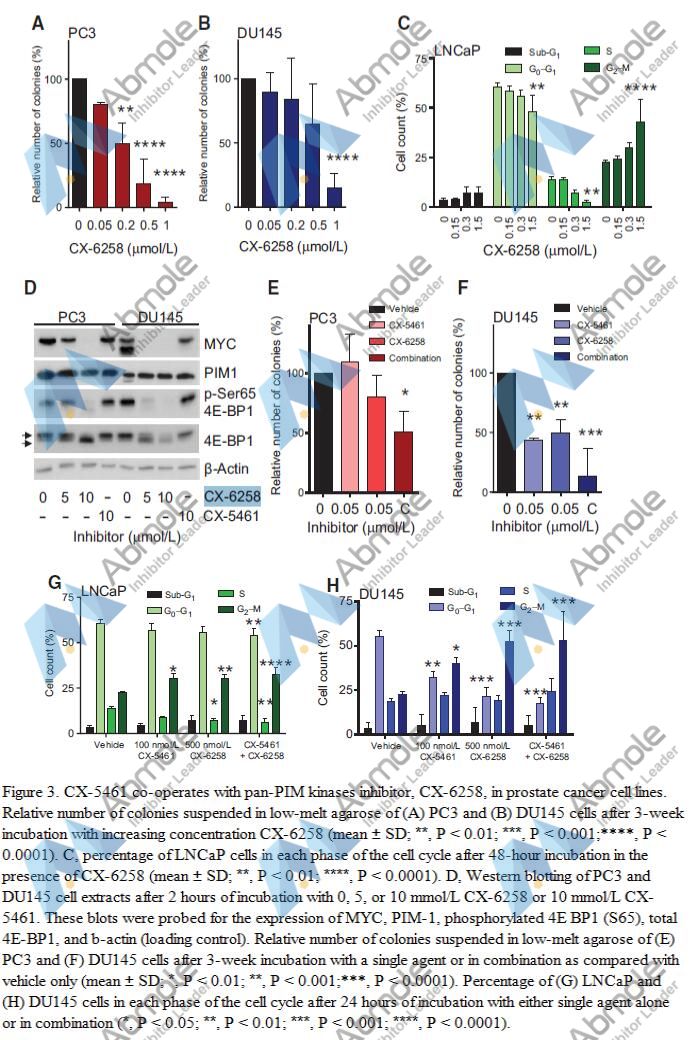 CX-6258 inhibited Flt-3 and Pim-3 (IC50=0.134 and 0.016 uM). CX-6258 is a reversible inhibitor of Pim-1 (Ki=0.005 uM). CX-6258 shows robust antiproliferative potencies against all cell lines tested derived from human solid tumors and hematological malignancies. CX-6258 shows dose-dependent efficacy in mice bearing MV-4-11 xenografts, with 45% and 75% TGI at 50 and 100 mg/kg/day, respectively.