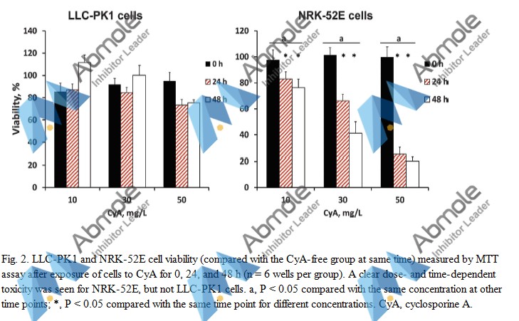Cyclosporine A (CsA,Cyclosporin A) is an immunosuppressant that binds to cyclophilin and inhibits calcineurin with an IC50 of 7 nM. Cyclosporine A [CsA] binds to the cyclophilin 18 (Cyp18)-CsA complex. the Cyp18-CsA complex recruits calcium-regulated neurophosphatase (CaN), leading to the blocking of cytokine gene transcription in activated T cells. CsA is a highly specific inhibitor of T-cell activation.