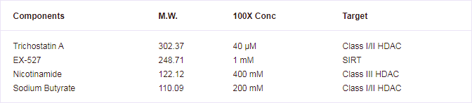 AbMole Deacetylase Inhibitor Cocktail (100X) is provided as 1 mL vial. Each vial contains 1 mL 70% DMSO with the following components: Trichostatin A (40 μM), EX-527 (1 mM), Nicotinamide (400 mM), and Sodium Butyrate (200 mM).