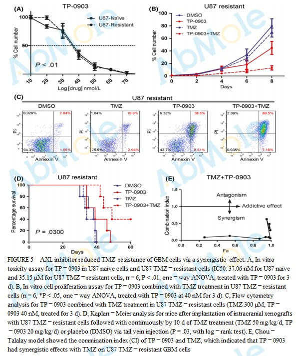 Dubermatinib (TP-0903) is a potent and selective AXL inhibitor with an IC50 value of 27 nM. TP-0903 induces massive apoptosis in CLL B cells with LD50 values of nanomolar ranges.