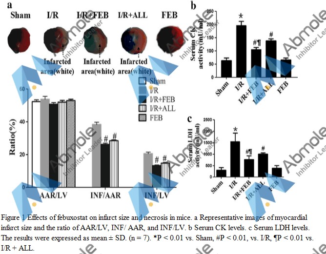 Febuxostat (TEI-6720) is a non-purine selective xanthine oxidase inhibitor with IC50 of 114 -210 nM. It works by non-competitively blocking the molybdenum pterin center which is the active site on xanthine oxidase. Xanthine oxidase is needed to successively oxidize both hypoxanthine and xanthine to uric acid. Hence, febuxostat inhibits xanthine oxidase, therefore reducing production of uric acid. Febuxostat inhibits both, oxidized as well as reduced form of xanthine oxidase because of which febuxostat cannot be easily displaced from the molybdenum pterin site.