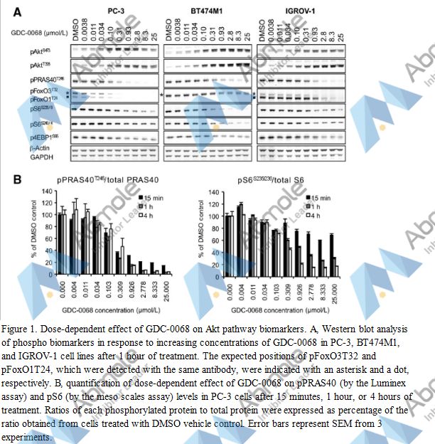 Ipatasertib (GDC-0068, RG7440) is a novel, ATP-competitive and orally bioavailable Akt inhibitor with IC50 values of 5 nM, 18 nM and 8 nM for Akt1, Akt2 and Akt3, respectively. Ipatasertib (GDC-0068) demonstrates potent inhibition of all three Akt isoforms in biochemical assays, but poor inhibition of other AGC family kinases. Moreover, GDC-0068 selectively inhibits cell cycle progression and viability of cancer cell lines driven by PI3K/Akt signaling pathway, including those with defects in the tumor suppressor PTEN, oncogenic mutations in PIK3CA, and amplification of HER2. GDC-0068 (Ipatasertib) blocks the phosphorylation of multiple downstream targets of Akt in human cancer cell lines. GDC-0068 (RG7440) shows good oral exposure resulting in dose-dependent pharmacodynamic effects on downstream biomarkers and a robust anti-tumor response in xenograft models in which the PI3K-Akt-mTOR pathway is activated.