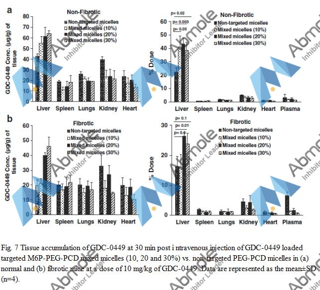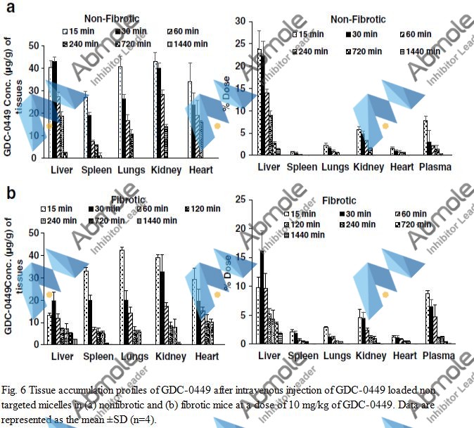 GDC-0449 (Vismodegib) is a potent and specific hedgehog (Hh) pathway, also inhibits ABCG2, Pgp and MRP1-important ABC transporters associated with MDR. The IC50 values of GDC-0449 for inhibition of ABCG2 and Pgp were 1.4 and 3.0μM, respectively. GDC-0449 (Vismodegib) has been used to treat medulloblastoma in animal models and has recently entered clinical trials for a variety of solid tumors.