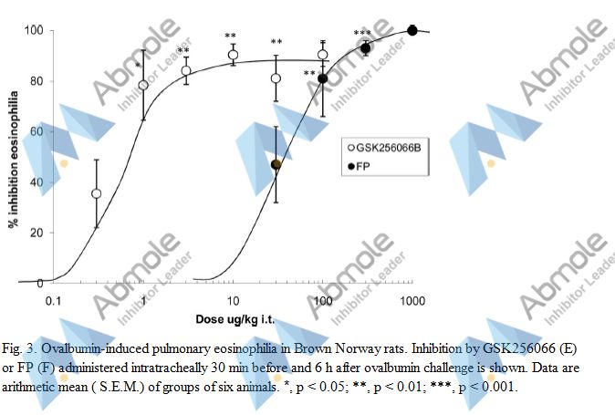 GSK256066 is a selective phosphodiesterase 4 (PDE4)inhibitor with an IC50 of 3.2 pM. Oral phosphodiesterase (PDE)4 inhibitors have demonstrated clinical efficacy in chronic obstructive pulmonary disease and asthma. Preclinical andclinical investigation of inhaled PDE4 inhibitors is ongoing. GSK256066 may have an improved therapeutic index compared with oral PDE4 inhibitors, e.g., cilomilast and roflumilast.GSK256066 demonstrates potent and long-lasting anti-inflammatory effects in animal models of pulmonary inflammation and does not induce emetic episodes in ferrets. GSK256066 has potential as an inhaled therapeutic for the treatment of asthma and chronic obstructive pulmonary disease.