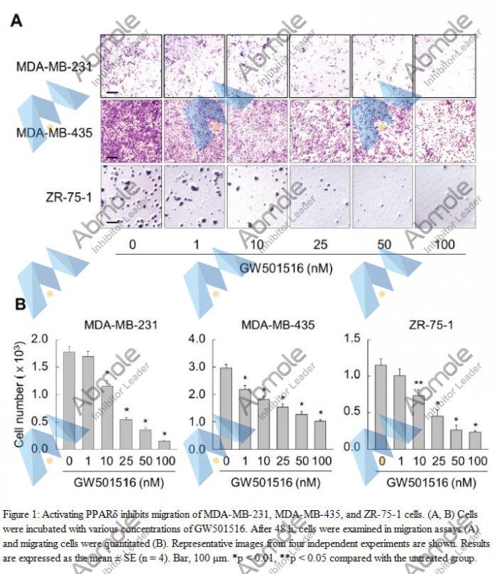 GW501516 (GSK-516, GW1516) is a potent and highly selective PPARβ/δ agonist, with EC50 of 1 nM, with 1000-fold selectivity over hPPARα and hPPARγ. The PPARβ/δ agonist GW501516 inhibited the increase caused by TNF-α in the mRNA levels of the NF-κB target genes interleukin 8 (IL-8), TNF-α and thymic stromal lymphopoietin (TSLP). GW501516 exhibited agonist effects with EC(50) values of 560 and 55 nM against PPARα and PPARδ, respectively, in a luciferase assay. Moreover, GW501516 also exhibited potent ability to induce oleic acid oxidation in a human myotube cell assay with EC(50)=3.7 nM. In contrast, GW501516 treatment decreased TNF-α-induced p65 acetylation. GW501516 increased AMPK phosphorylation and the subsequent p300 phosphorylation, leading to a marked reduction in the association between p65 and this transcriptional co-activator.