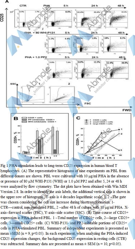 JANEX-1 (WHI-P131) shows potent JAK3-inhibitory activity (IC50 of 78 μM), does not inhibit JAK1 and JAK2, the ZAP/SYK family tyrosine kinase SYK, the TEC family tyrosine kinase BTK, the SRC family tyrosine kinase LYN, or the receptor family tyrosine kinase insulin receptor kinase, even at concentrations as high as 350 μM. JANEX-1 induces apoptosis in JAK3-expressing human leukemia cell lines NALM-6 and LC1;19 but not in melanoma (M24-MET) or squamous carcinoma (SQ20B) cells.