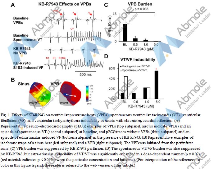 KB-R7943 is a plasma membrane Na(+)/Ca(2+) exchanger inhibitor. KB-R7943 reversibly inhibits inward and outward Na+/Ca2+ exchange in a dose-dependent manner (MCU; IC50 = 5.5 μM), but it does not affect Na+-dependent transport systems or ionotropic glutamate receptors. In addition, the effects of KB-R7943 on Ca(2+) homeostasis provide new evidence for the role of mitochondria modulating Ca(2+)-release and regenerative Ca(2+)-oscillations. KB-R7943 (10 and 30 microM) suppressed the tonotropic effect of ouabain, and prolonged the onset time of extra-systole induced by ouabain in isolated atria. KB-R7943 suppresses ouabain-induced arrhythmias through inhibition of the reverse-mode NCX. KB-R7943 is also a potent blocker of the transient receptor potential channels (TRPC) TRPC3, TRPC5 and TRPC6.