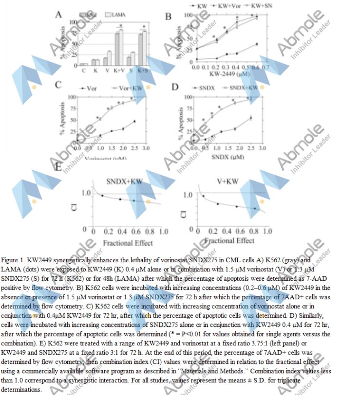 KW-2449 is a multikinase inhibitor of FLT3, ABL, ABL-T315I and Aurora kinase that induces cytotoxicity in Molm14 cells (which harbor an FLT3/ITD mutation). In addition, KW-2449 potently inhibited ABL-T315I, which is associated with IM resistance, with an IC50 value of 4 nM. KW-2449 showed the potent growth inhibitory effects on leukemia cells with FLT3 mutations by inhibition of the FLT3 kinase, resulting in the down-regulation of phosphorylated-FLT3/STAT5, G(1) arrest, and apoptosis. Oral administration of KW-2449 showed dose-dependent and significant tumor growth inhibition in FLT3-mutated xenograft model with minimum bone marrow suppression. In FLT3 wild-type human leukemia, it induced the reduction of phosphorylated histone H3, G(2)/M arrest, and apoptosis. In imatinib-resistant leukemia, KW-2449 contributed to release of the resistance by the simultaneous down-regulation of BCR/ABL and Aurora kinases. KW-2449 has significant activity and warrants clinical study in leukemia patients with FLT3 mutations as well as imatinib-resistant mutations.