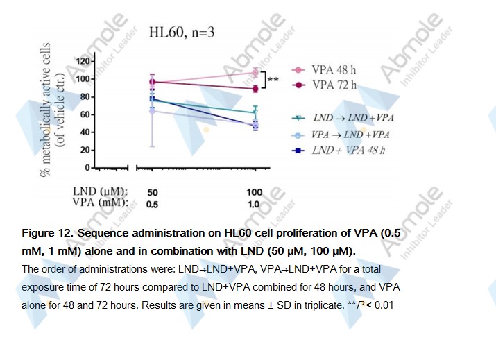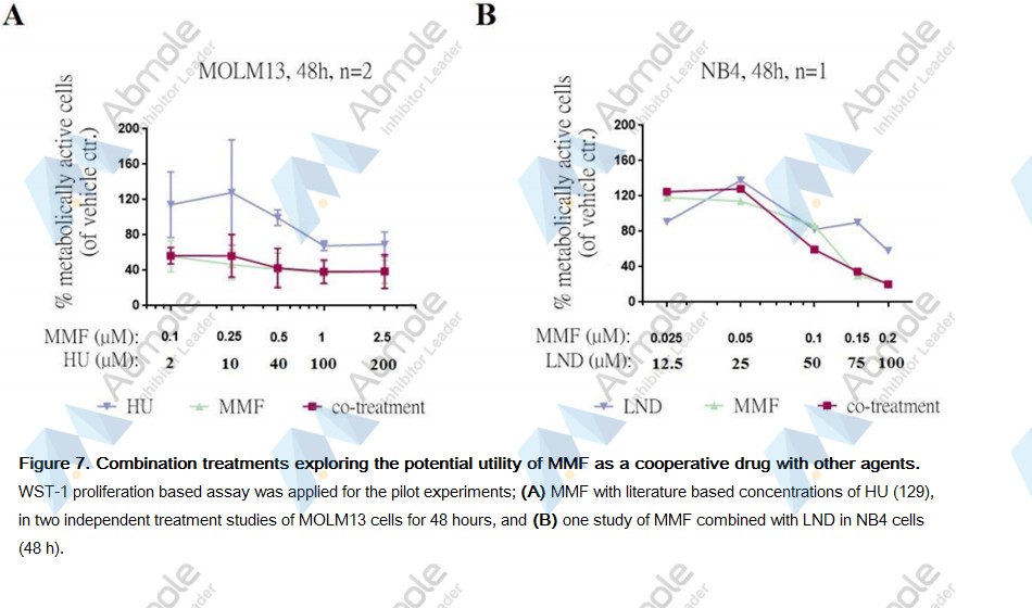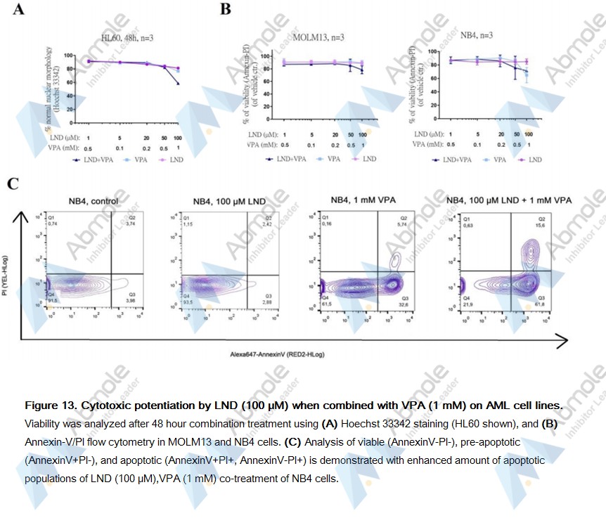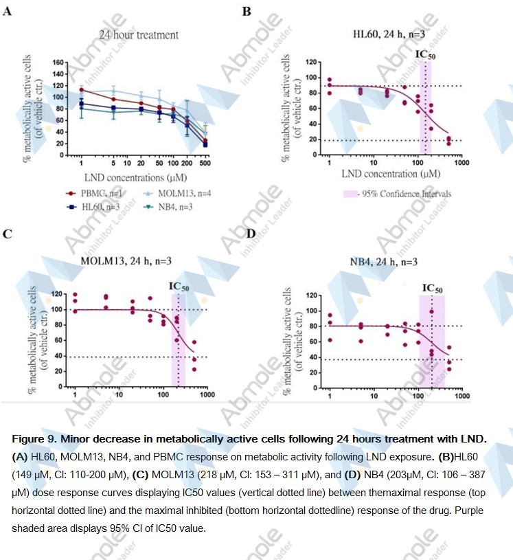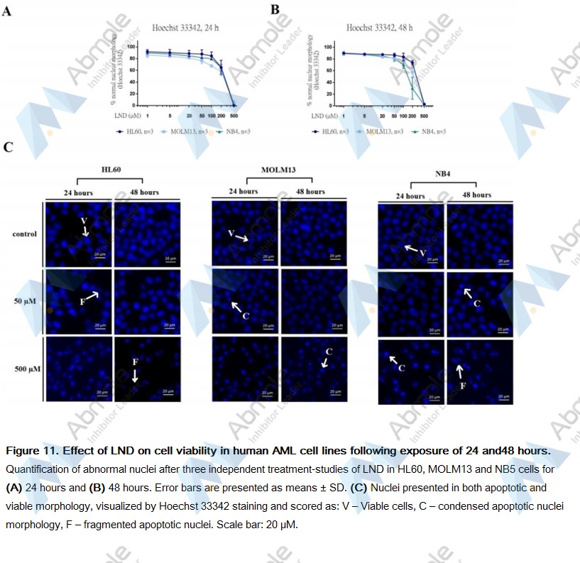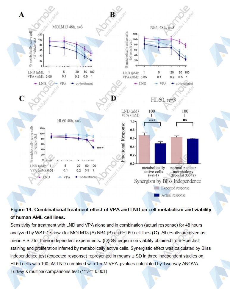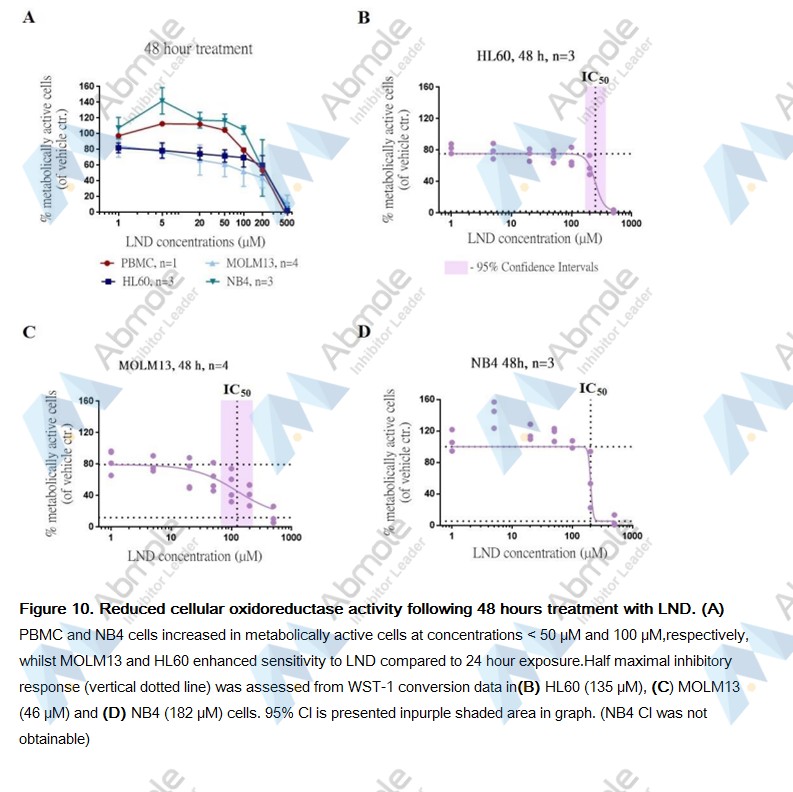 | Preparation method | Spectrophotometric quantification of cell proliferation was assayed by the water soluble tetrazolium salt-1 (WST-1) (AbMole, M28552) based colorimetric assay. This tetrazolium salt is reduced extracellularly to formazan dye by enzymes of the plasma membrane oxidoreductase. The primary reductant is NADH derived from the TCA of the mitochondria. Hence, WST-1 is converted by metabolically active cells and was employed to measure cell proliferation. The cell lines HL60, MOLM13 and NB4 were plated in triplicate (20×10^3 cells/well) in a 96-well microplate and treated with either LND (1, 5, 20, 50, 100, 200, and 500 µM) . |