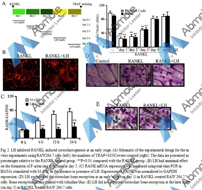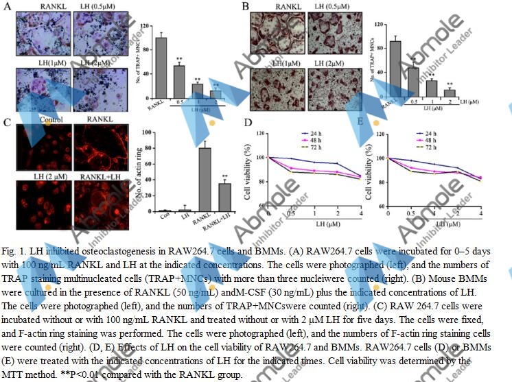 | Preparation method | RAW 264.7 cells were seeded in a 6-cm dish and pretreated with different concentrations of LH (2 μM) for 6 h, and then stimulated with RANKL (100 ng/mL) for 15 min. The cells were washed with icecold PBS and lysed in radioimmunoprecipitation assay (RIPA) buffer. |