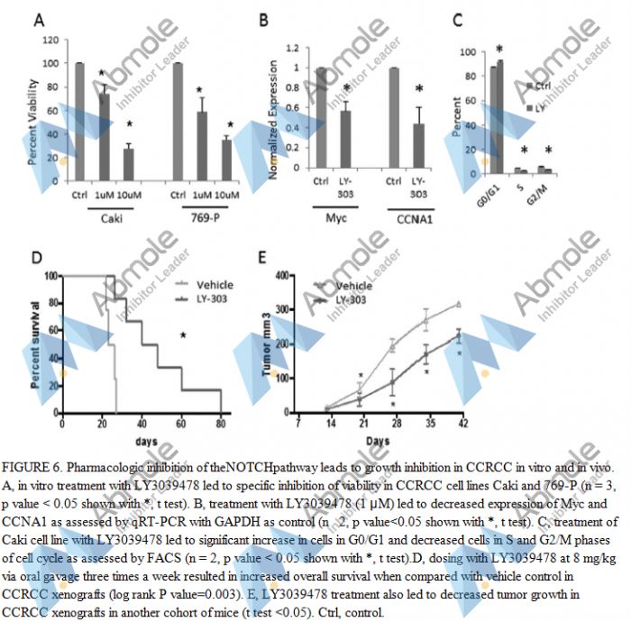 LY3039478 (Crenigacestat) is a novel and orally active Notch and γ-secretase inhibitor, with an IC50 of 1 nM in most of the tumor cell lines tested. Crenigacestat (LY3039478) decreases expression of Myc and cyclin A1 (part of the NOTCH-driven proliferative signature) in murine and human model systems. Crenigacestat (LY3039478) treatment also leads to G0/G1 cell cycle arrest in CCRCC cells.