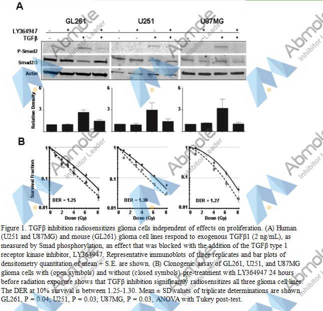 LY-364947 is a selective, ATP-competitive inhibitor of Transforming Growth Factor-β Type I receptor kinase. LY364947 inhibits TGF-β-dependent luciferase production in mink lung cells (p3TP lux) and growth in mouse fibroblasts (NIH 3T3) (IC50 values are 47 and 89 nM respectively). LY364947 is much less potent at related kinases, with IC50 of 400 nM for TGF-β RII and IC50 of 1400 nM for mixed lineage kinase-7 (MLK-7), a kinase in the MAP kinase signal pathway and closely related to TGF-β RII. LY364947 (3 μM) induces expression of Prox1 and LYVE-1 in almost all HDLECs after 24 hours. LY364947 (25 mg/kg) increases p-Akt and decreases nuclear Foxo3a in leukaemia-initiating cells in CML-affected mice.