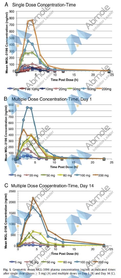 Resmetirom (MGL-3196) is a liver-targeted selective agonist for the thyroid hormone receptor-β (THR-β) designed to increase cholesterol uptake into the liver and increase its metabolism. Resmetirom (MGL-3196) was well-tolerated at all doses with no dose-related adverse events or liver enzyme, ECG or vital-sign changes. Resmetirom (MGL-3196) showed a beneficial effect on lipid parameters.