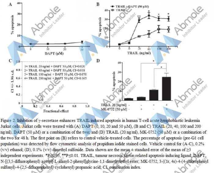 MK-0752 is a potent gamma secretase inhibitor, an enzyme required for Notch pathway activation. MK-0752 reduces Aβ40 production with IC50 of 5 nM in human SH-SY5Y cells. MK-0752 blocks Notch-intracellular domain (ICD) cleavage and its subsequent nuclear translocation in vitro. MK-0752 treatment increases levels of Aβ 1-14, Aβ 1-15 and Aβ 1-16, while decreases levels of Aβ 1-17. Phase I clinical trials has been completed in 2006, and the results reported showed that MK-0752 was well-tolerated in a limited number of patients below 300 mg/m2, and further enrollment was underway to establish the MTD.