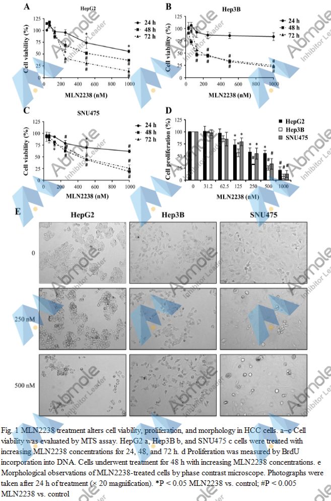 MLN2238 is a potent reversible and specific β5 site of the 20S proteasome inhibitor with an IC50 value of 3.4 nM. Proteasome activity was significantly inhibited in both blood and tumor following a single dose of MLN2238 administered IV at 14 mg/kg or SC at 4 mg/kg. It is active in preclinical models of lymphoma, and that MLN2238 has antitumor activity in a model of lymphoma that is refractory to bortezomib treatment.