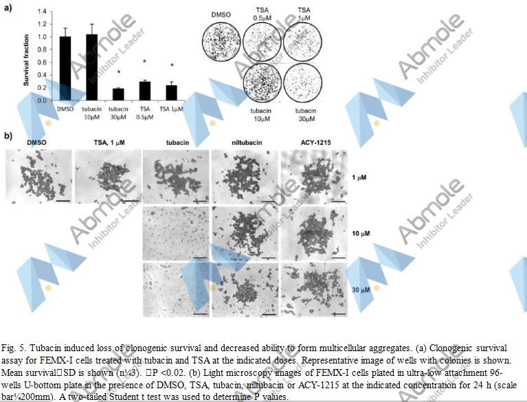 Niltubacin, as an inactive derivative of Tubacinis, is a highly potent and selective, reversible cell-permeable inhibitor of HDAC6. Histone deacetylase 6 (HDAC6) is structurally and functionally unique among the 11 human zinc-dependent histone deacetylases. HDAC6-selective inhibitor tubacin significantly enhances cell death induced by the topoisomerase II inhibitors etoposide and doxorubicin and the pan-HDAC inhibitor SAHA (vorinostat) in transformed cells (LNCaP, MCF-7), an effect not observed in normal cells. The inactive analogue of tubacin, nil-tubacin, does not sensitize transformed cells to these anticancer agents.