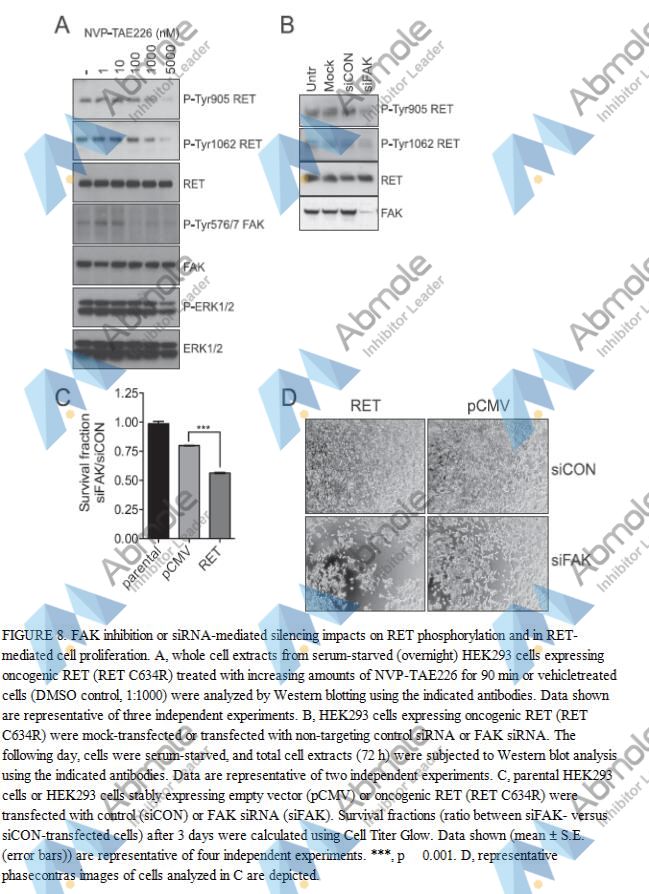 Nvp-tae 226 (TAE226) is a potent atP-competitive dual FAK and IGF-1R inhibitor with IC50 of 5.5 nM and 140 nM, respectively. Nvp-tae 226 (TAE226) also effectively inhibited Pyk2, insulin receptor (InsR), with IC50 of 3.5 nM and 40 nM.