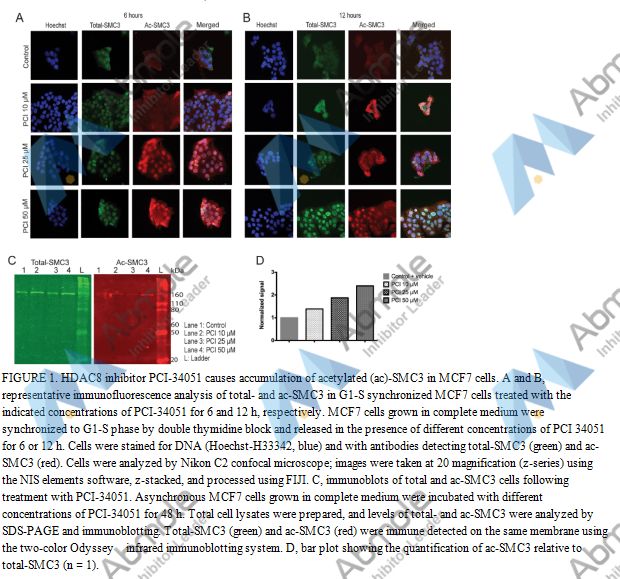 PCI-34051 is a potent and selective inhibitor of HDAC8 with >200-fold selectivity over the other HDAC isoforms 1, 2, 3, 6 and 10 with IC50 values of 4, >50, >50, 2.9 and 13 μM, respectively. PCI-34051 induces caspase-dependent apoptosis in cell lines derived from T-cell lymphomas or leukemias (GI50s = 2.4 - 4 μM), but not in other hematopoietic or solid tumor lines. PCI-34051 does not cause detectable histone or tubulin acetylation like other broad-spectrum HDAC inhibitors. PCI-34051-induced apoptosis upon treatment with a PLC inhibitor U73122 showed a dose-dependent decrease on Jurkat cells. The mechanism by which PCI-34051 induces apoptosis in T-cell lines is also novel to the histone deacetylase field; it involves Ca2+ signaling via phospholipase C-gamma1.