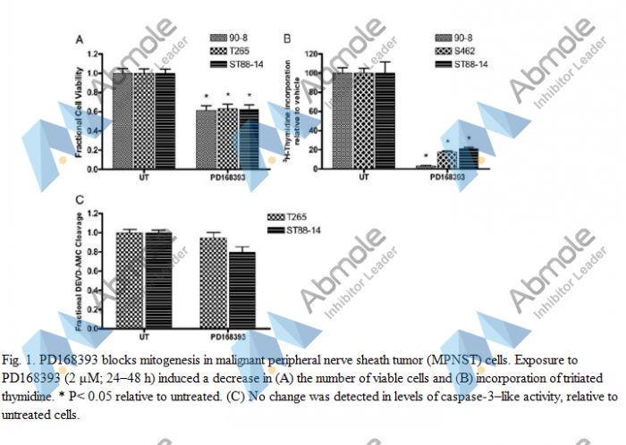 PD168393 is an irreversible EGFR inhibitor with IC50 of 0.70 nM, irreversibly alkylate Cys-773; inactive against insulin, PDGFR, FGFR and PKC. PD168393 inhibits heregulin-induced tyrosine phosphorylation in MDA-MB-453 cells with IC50 of 5.7 nM. PD168393 is inactive against insulin, PDGF and basic FGFR TKs as well as PKC. PD168393 inhibits EGF-mediated tyrosine phosphorylation in HS-27 human fibroblasts with IC50 of 1-6 nM but has little effect on FGF- or PDGF-mediated tyrosine phosphorylation. PD 168393 produces tumor growth inhibition of 115% in A431 human epidermoid carcinoma xenograft in nude mice, with 50% reduced phosphotyrosine content of EGFR. PD 168393 also shows a low plasma concentration.