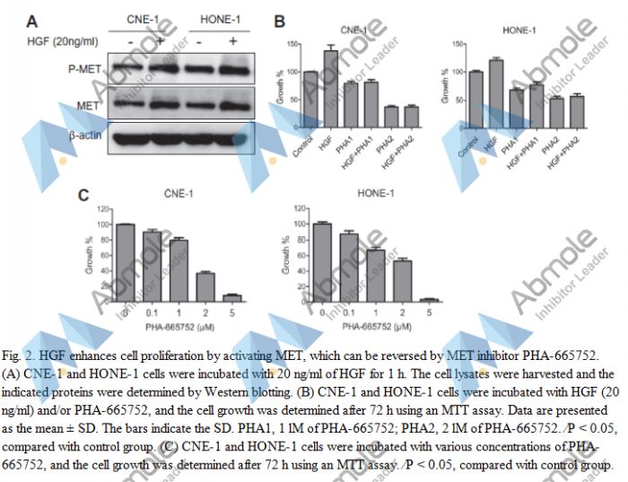PHA-665752 is a small-molecule inhibitor of c-Met, inhibits tumorigenicity and angiogenesis in mouse lung cancer xenografts. c-Met is a tyrosine kinase receptor for hepatocyte growth factor/scatter factor (HGF/SF). PHA665752 inhibited specific phosphorylation of TPR-MET as well as phosphorylation of downstream targets of the mammalian target of rapamycin pathway. Short-term treatment with PHA-665752 decreased the numbers of premalignant lung lesions and induced apoptosis in tumor cells and vascular endothelial cells within lesions. In cell culture, PHA-665752 induced apoptosis of a lung adenocarcinoma cell line derived from Kras(LA1) mice (LKR-13) and a murine lung endothelial cell line (MEC). PHA665752 was shown to inhibit cMet/HGF/SF signaling in vitro, suggesting c-Met inhibitors may have efficacy for blocking local progression and/or metastatic spread of c-Met-positive NBL in vivo.