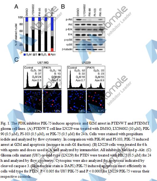 PIK-90 is a novel and potent PI3K inhibitor with IC50 values of 11 nM, 350 nM, 18 nM and 58 nM for p110α, p110β, p110γ and p110δ respectively. Phosphoinositide 3-kinases (PI3Ks) are among the most frequently activated signaling pathways in cancer. Inhibition with p110alpha inhibitor PIK-90 resulted in a significant reduction of chemotaxis and actin polymerization to CXCL12 and reduced migration beneath MSC (pseudoemperipolesis). In suspension and MSC cocultures, PIK-90 was potent inducers of CLL cell apoptosis.