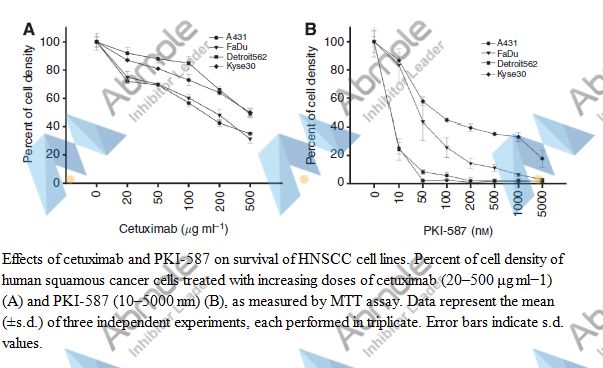 PKI-587 (Gedatolisib; PF-05212384) is a highly potent dual PI3K/mTOR kinase inhibitor. PKI-587 (PF-05212384) potently inhibited class I PI3Ks (IC (50) vs. PI3K-α = 0.4 nmol/L), PI3K-α mutants, and mTOR. PKI-587 (PF-05212384) inhibited growth of 50 diverse human tumor cell lines at IC (50) values of less than 1nm. PKI-587 (PF-05212384) also inhibit 236 human protein kinases (IC50s >10 μM. Only wild type and mutant (V600E) B-Rafs were inhibited by PKI-587 at IC50 values of 10μM.