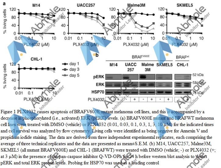 Vemurafenib (PLX4032) is a first-in-class, potent, selective inhibitor of B-Raf that inhibits RAFV600E and C-RAF-1 activity with IC50s of 31 nM and 48 nM, respectively.In addition, Vemurafenib induces autophagy.