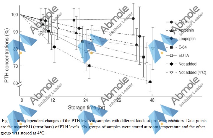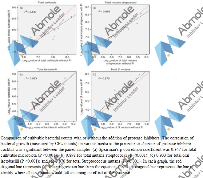 AbMole Protease Inhibitor Cocktail is a protease inhibitor composed of 6 independent protease inhibitors (excluding EDTA), which are configured according to the optimum mixture ratio. The target is respectively serine proteinase, serine cysteine proteinase, aminopeptidase, cysteine proteinase and aspartic proteinase, which are widely used in various proteases and can be called broad spectrum protease inhibitors.