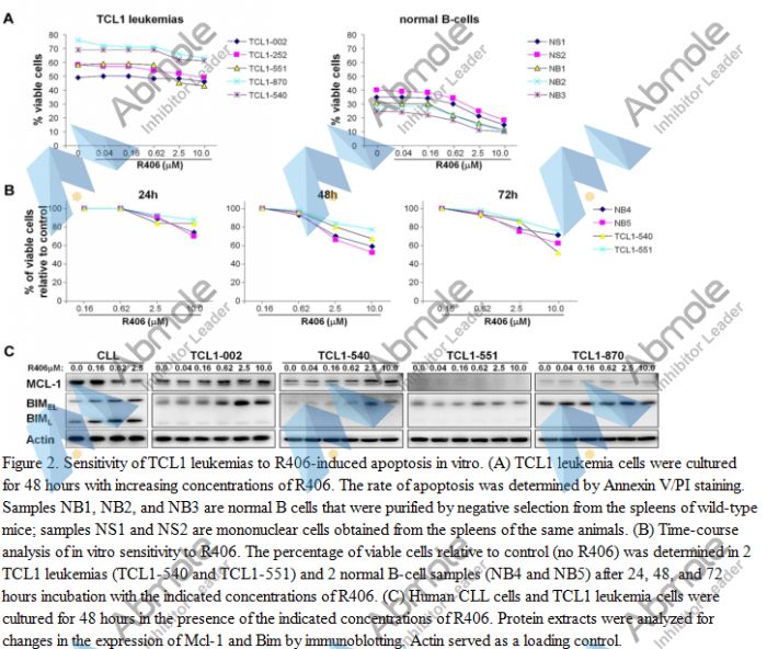 Fostamatinib (R788) is a precursor of the active compound tamatinib (R-406), which is an inhibitor of the enzyme spleen tyrosine kinase (Syk). R788 (Fostamatinib) effectively inhibits BCR signaling in vivo, resulting in reduced proliferation and survival of the malignant B cells and significantly prolonged survival of the treated animals. R788 also inhibits the anti-IgE-induced production and release of LTC4 and cytokines and chemokines, including TNFα, IL-8 and GM-CSF. R788 (Fostamatinib) induces apoptosis of the majority of examined DLBCL cell lines.