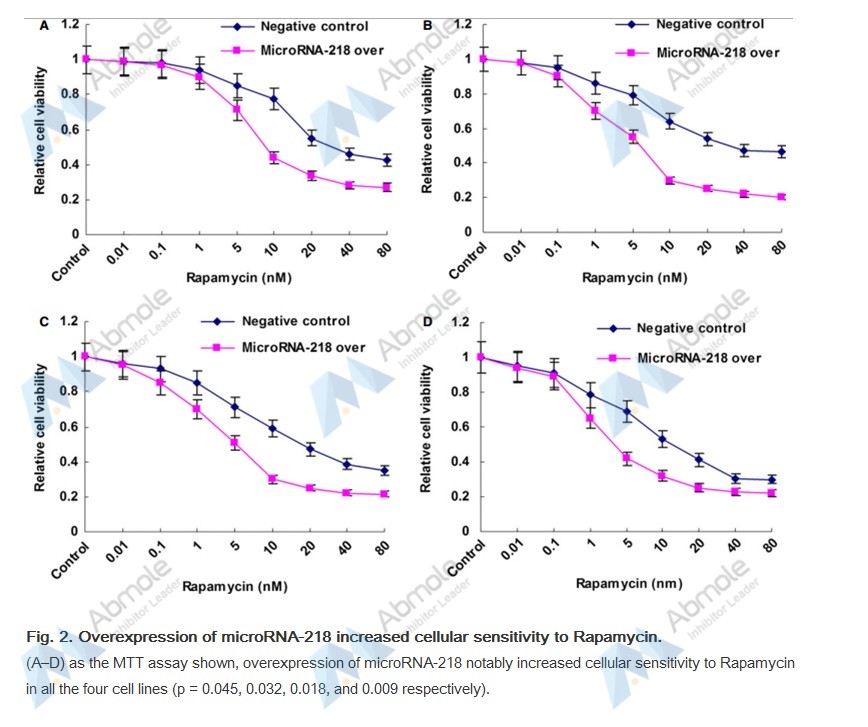 | Preparation method | MTT assay. In brief, 2*103 cells/well were seeded into 96-well plates and routinely cultured overnight. Then, these cells were treated with Rapamycin for 72 h. Next, 5 µL MTT (5 mg/ mL; M7007) and 200 µL DMSO were sequentially added into each well and the absorbance was measured at the wavelength of 570 nm. |