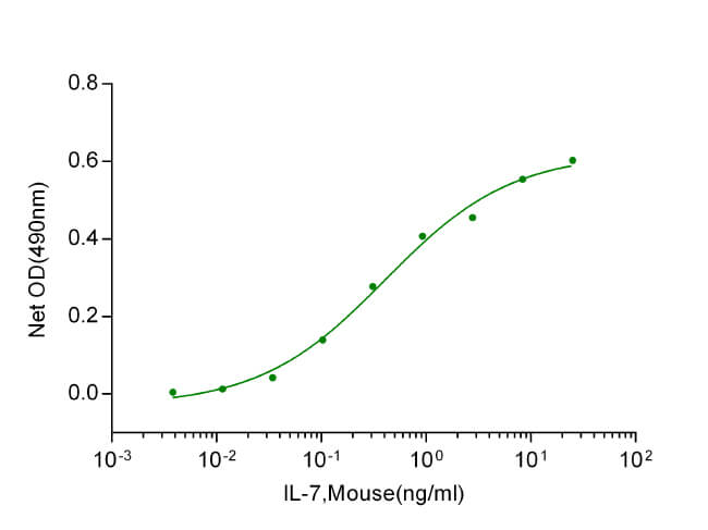 Recombinant Mouse IL-7 (Interleukin-7), also known as lymphopoietin 1 and pre-B cell factor, is a hematopoietic growth factor belonging to the IL-7/IL-9 family. It is produced by keratinocytes, dendritic cells, hepatocytes, neurons and epithelial cells. IL-7 binds and signals through IL-7 receptor, a heterodimer consisting of IL-7 receptor alpha and common gamma chain receptor. IL-7 plays a role in regulating early B cell and T cell development.