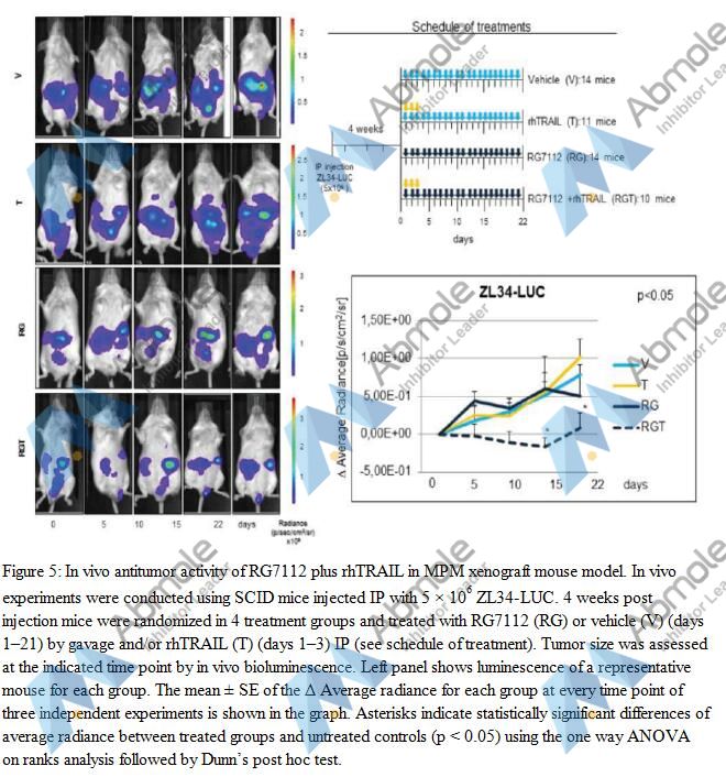 RG7112 (RO5045337) is the first-in-class small-molecule MDM2 inhibitor designed to occupy the p53-binding pocket of MDM2. In cancer cells expressing wild-type p53, RG7112 stabilizes p53 and activates the p53 pathway, leading to cell cycle arrest, apoptosis, and inhibition or regression of human tumor xenografts.